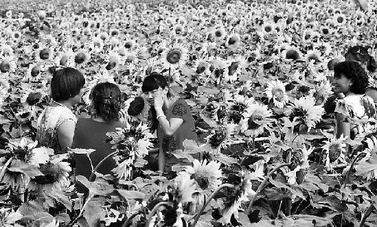 图为游客在百亩葵花园观赏盛开的葵花并留影