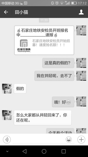 昨日,在微信朋友圈里,一条“石家庄地铁安检员开班报名中—速报”信息开始广泛流传,其中还有石家庄地铁的LOGO,说要招募50-100人。这是真的,还是假的?对此,记者拨通了上面的电话,对方告知,他们是一家咨询服务公司,受国家铁路局委托进行地铁安检员的招聘,不收取任何的咨询费和报名费,面试合格后,会到国家铁路局指定的培训中心进行培训。可是这国家铁路局与地铁有什么关系呢?对方竟说:“地铁就属于国家铁路局呀!”这让记者哭笑不得。而到16时45分许,记者再试图打开这条微信信息,已经显示打不开,其内容已被发布者删除。