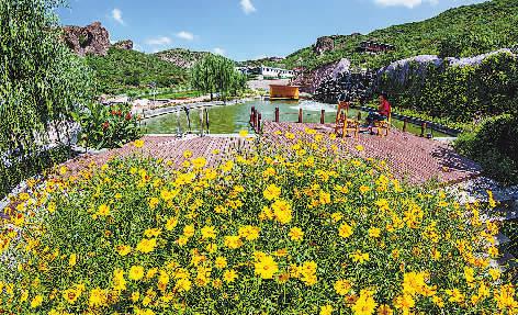 采访团来到度假村内,道路两旁鲜花怒放,垂钓鱼塘休息区里,鸽子塔、四合院、小木屋,错落有致,还有一些形似骆驼、狮子、鼹鼠的奇石,吸引了不少绘画爱好者来此写生。