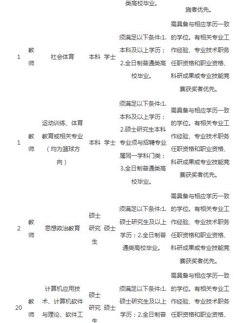 初中、小学文化课教师招聘近三届一批全日制直本及以上学历毕业生(不含艺术类、对口招生的毕业生);近三届二批全日制直本毕业生,专业对口。