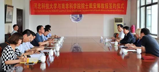 近日,南非国家科学院院士戴安娜•希尔德布兰特(Prof. Diane Hildebrandt)与河北科技大学签署协议,受聘该校特聘教授。图为签约仪式现场。