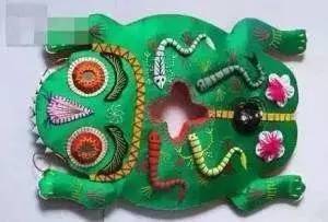 除了五色线手环,端午节里小朋友们还会得到另一个特殊的礼物——蛤蟆项链。这个蛤蟆也是纯手工制作的,都是用布缝制的。在缝制蛤蟆的时候,蛤蟆的嘴不会缝住,而是用来装药的,这样小孩佩戴之后就不会生病;蛤蟆身上还要缝一个小扫帚,用来扫病,这个蛤蟆和五色线的戴法及作用相同,都是五月初一佩戴,端午节那天扔到河里冲走。