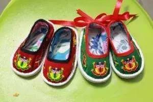 五毒鞋一般以红色的布为鞋面,也有的地方以绿缎子做鞋面,鞋面头脸处绣一大蛤蟆头,鞋帮处绣上蜈蚣、蝎子、壁虎、蛇等毒虫形象。现在的五毒鞋一般市场上都有卖的,自己亲手为孩子做五毒鞋的越来越少了。其他一些地方吃“五毒饼”、画“五毒图”,都有类似的含义。