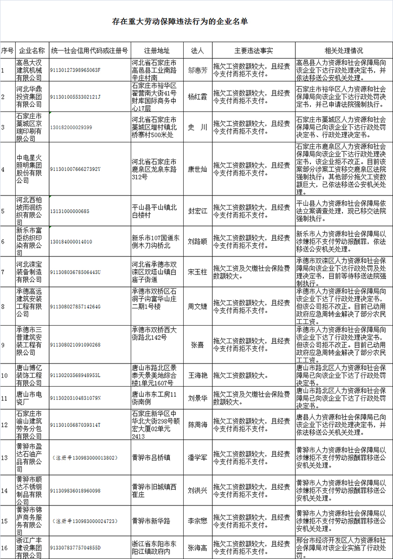 河北新闻网6月23日讯(记者王萌)记者从河北省人社厅获悉,按照《重大劳动保障违法行为社会公布办法》(人力资源和社会保障部令第29号)和《河北省重大劳动保障违法行为社会公布实施办法》(冀人社规〔2016〕7号)有关规定,河北省人社厅将存在重大劳动保障违法行为的16家企业有关情况予以公布。