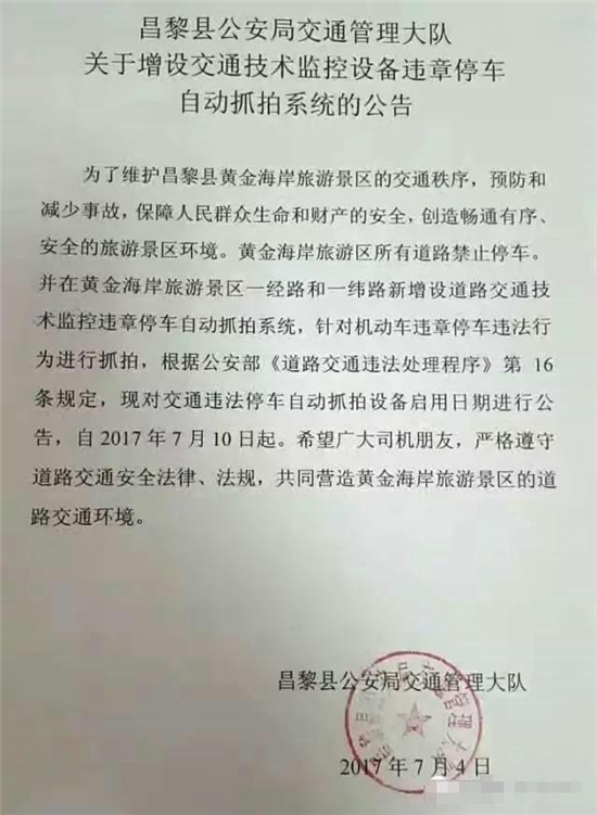 秦皇岛市昌黎县公安局交通管理大队发出公告,昌黎黄金海岸旅游区所有道路禁止停车,并在部分路段安装了自动抓拍系统,针对机动车违章停车进行抓拍,7月10日起正式启用。