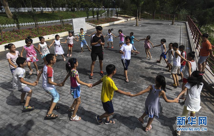 7月17日,两名受助大学生(中)在带领孩子们做游戏。