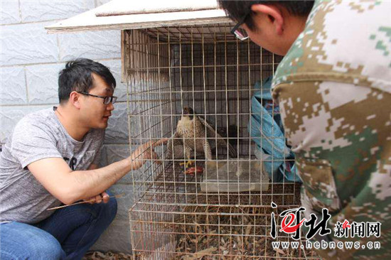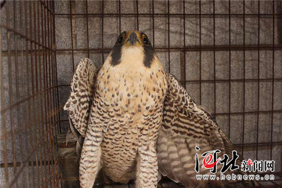 近日,万全县安家堡乡村民在田里干活时,发现一只受伤的珍稀鸟类,后经过辨认,该鸟是国家二级保护动物游隼。图为被救助的国家二级保护动物游隼。