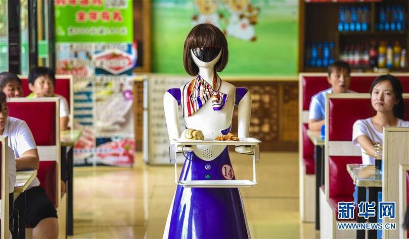 7月19日,在深州市阳坊饭店,机器人为顾客送餐。河北省深州市一家饭店引进智能送餐机器人当“跑堂”,吸引了众多顾客的目光。 新华社记者 李晓果 摄