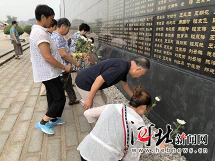 7月17日,唐山市路南区梁家屯路街道尚义社区居民在唐山抗震纪念墙前祭奠罹难者。梁靓摄
