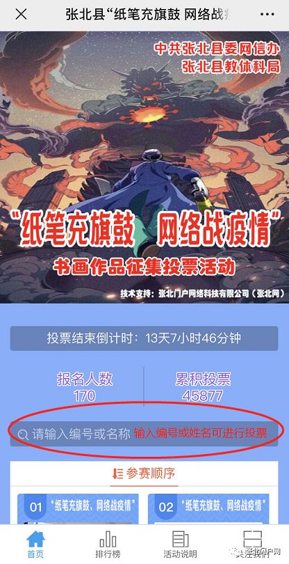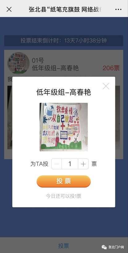 各位参赛选手、家长们,大家期盼已久的“纸笔充旗鼓、网络战疫情”书画作品征集活动终于到了投票阶段了!作品征集期间,我们一共收集到了来自张北县各学校学生作品700余幅,经过重重筛选,我们共筛选出170幅优秀作品参加投票。