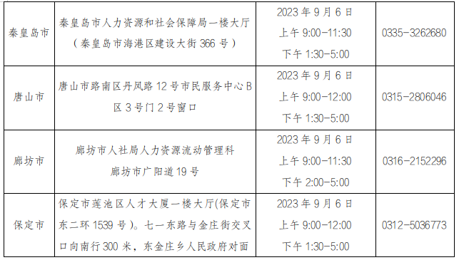 参加2023年“三支一扶”笔试考试且笔试成绩在报考调剂岗位最低控制分数线之上的考生可以报名。以下人员不在调剂补录范围:面试缺考的、应参加体检放弃的、体检通过后放弃的和体检未通过的考生;在2023年“三支一扶”考试中被认定为有违纪行为的考生;培训期间放弃的和培训后放弃的考生;已招募的2023年“三支一扶”人员。1.报考人员应符合招募岗位规定的条件和要求。具体岗位见《河北省2023年高校毕业生“三支一扶”计划调剂补录岗位信息表》(附件1);3.有户籍限制的市、县(市、区)在限制的区域内报名,无户籍限制的市、县(市、区)可跨市县报名。岗位调剂补录采取保留笔试成绩、再次面试的方式进行,面试采取结构化面谈的方式,满分100分,60分为合格线,现场打分。面试成绩于面试当日在面试地点公布。采取现场报名和资格审查同步方式进行,时间为2023年9月6日上午9:00—12:00,下午1:30—5:00。考生现场报名时需提交2份填写打印好的《河北省2023年高校毕业生“三支一扶”计划调剂补录报名表》(附件2)及相关佐证材料,在规定时间内到各市人力资源和社会保障局指定地点(附件3)进行现场报名及资格审查。考生须提供户口页(首页及本人页)、身份证、毕业证、学位证、教育部学历证书电子注册备案表等相关材料。留学人员应持国家教育部留学服务中心认证学历、学位参加资格审查。考生不能提供有关材料、提供的材料与报名信息不一致或提供虚假证件、证明的,不得参加调剂补录。对通过现场资格审查的考生,由各市人力资源和社会保障局按照笔试成绩从高分到低分以1:3的比例确定进入面试人选,不足1:3比例的,按照实际报名人数确定,如多人笔试成绩相同且同时进入1:3比例的,一并进入面试。进入面试考生由各市电话通知。进入面试环节的考生请于9月8日09:00—10日08:00登录报名网址自行打印《调剂补录面试准考证》(报名网址:http://121.28.131.187:8035)。《面试准考证》要求打印清晰,黑白彩色均可。未在规定时间内打印《调剂补录面试准考证》的考生视为放弃面试。面试定于2023年9月10日全省统一进行,为上午8:00—12:00和下午2:00—5:00。面试采取结构化面谈的形式,主要测评考生的综合分析能力、解决实际问题能力、应变与自我控制能力、语言表达能力等。面试采取“体操打分法”计分,即每组评委打出的分数,去掉一个最高分和一个最低分,将其余评委的评分相加之和除以其余评委数(即:考生的最后得分=其余评委的评分之和÷其余评委数),计算出考生的最后得分,即为考生的面试成绩。如招募岗位实际面试人员未形成竞争(即参加面试人数少于或等于该岗位拟招募人数),该岗位面试人员面试成绩低于其所在面试考官组使用同一面试题本面试所有人员平均成绩的,取消招募资格。调剂补录面试结束后,按笔试成绩、调剂面试成绩两部分计算考试总成绩,满分为100分,其中笔试成绩、调剂招募面试成绩各占50%。计算考生总成绩时,保留小数点后两位。9月12日上午09:00登录报名网址(报名网址:http://121.28.131.187:8035)查询综合成绩。综合成绩并列的,按以下顺序确定入闱考生:已参加住院医师规范化培训的医学类毕业生、笔试成绩较高者、中共党员、学历(学位)较高者。体检由各市人力资源和社会保障局统一组织,体检标准参照《公务员录用体检通用标准》执行。未在规定时间内参加体检者、体检不合格者、体检合格自愿放弃者,取消拟招募人选资格。根据综合成绩和体检结果,确定拟调剂补录人员名单,统一在河北人社网、河北人才网进行公示,公示期为5个工作日。凡考生未在规定时间内按要求参加报名、资格审查、面试、体检等情况的,均视为自动放弃调剂补录资格,在调剂补录的任何环节,如发现考生不符合招募条件或弄虚作假的,均取消招募资格。
